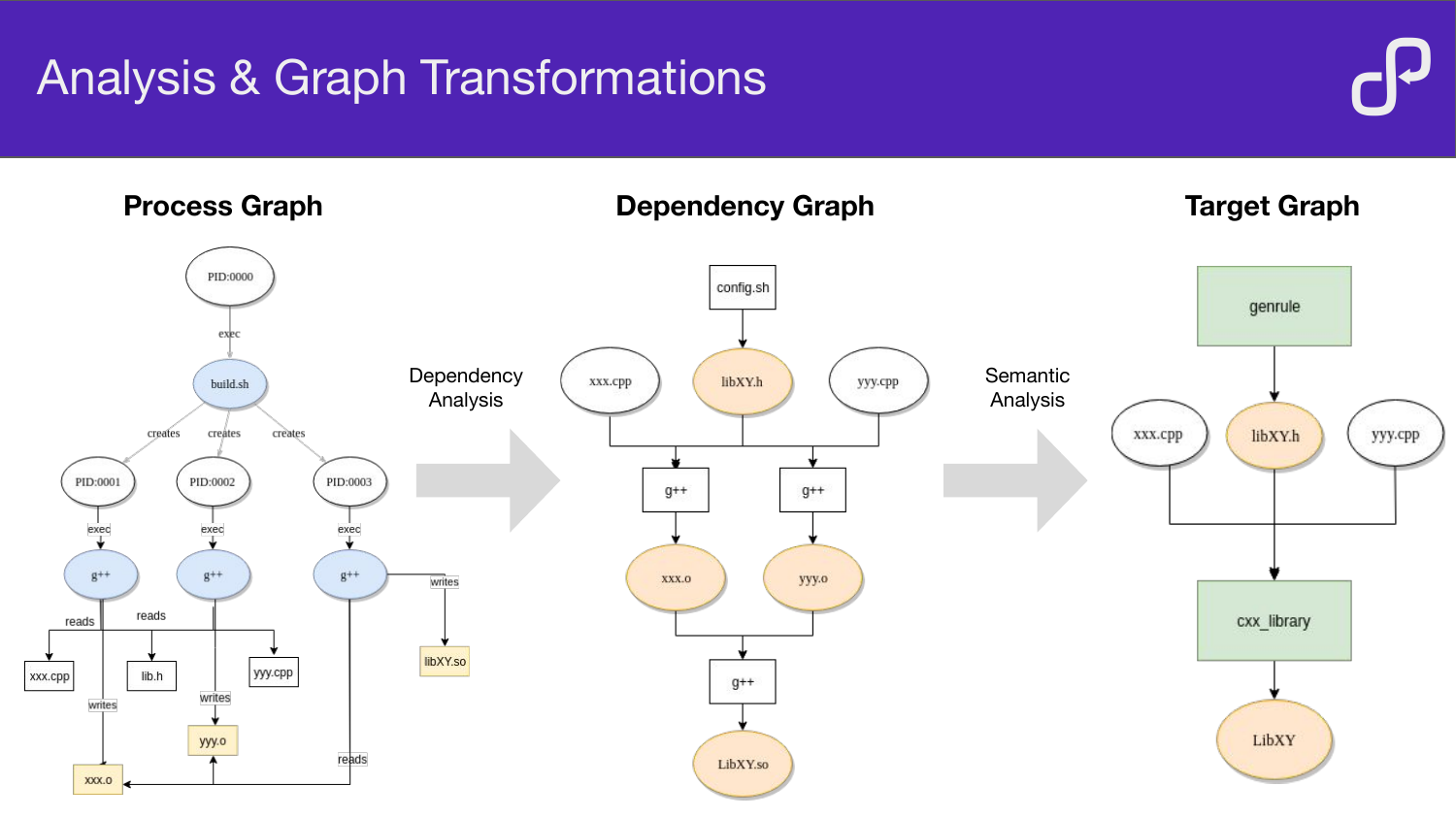 cpandmvoperations are rewired so the graph reflects logical dependencies, not filesystem mechanics) - Target Graph: compiler invocations are grouped into libraries and executables, compiler flags are reconciled across translation units, glob expressions are computed to describe target inputs, and bash commands are rewritten to use relative paths