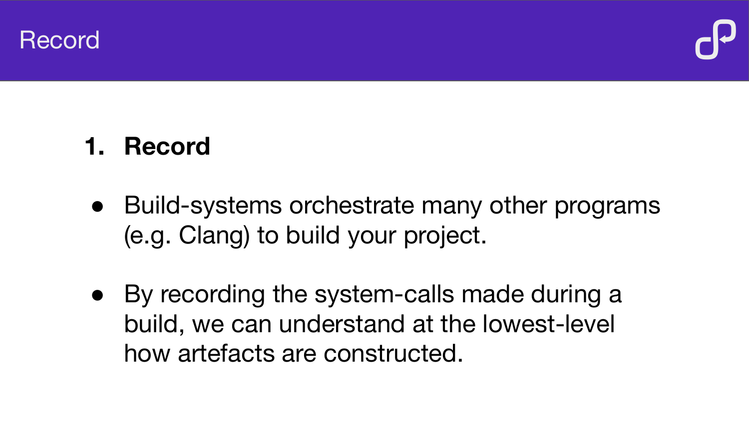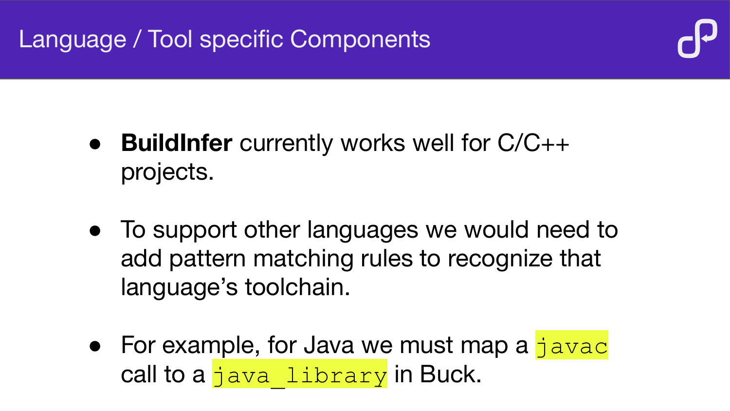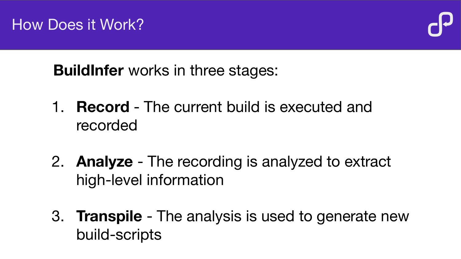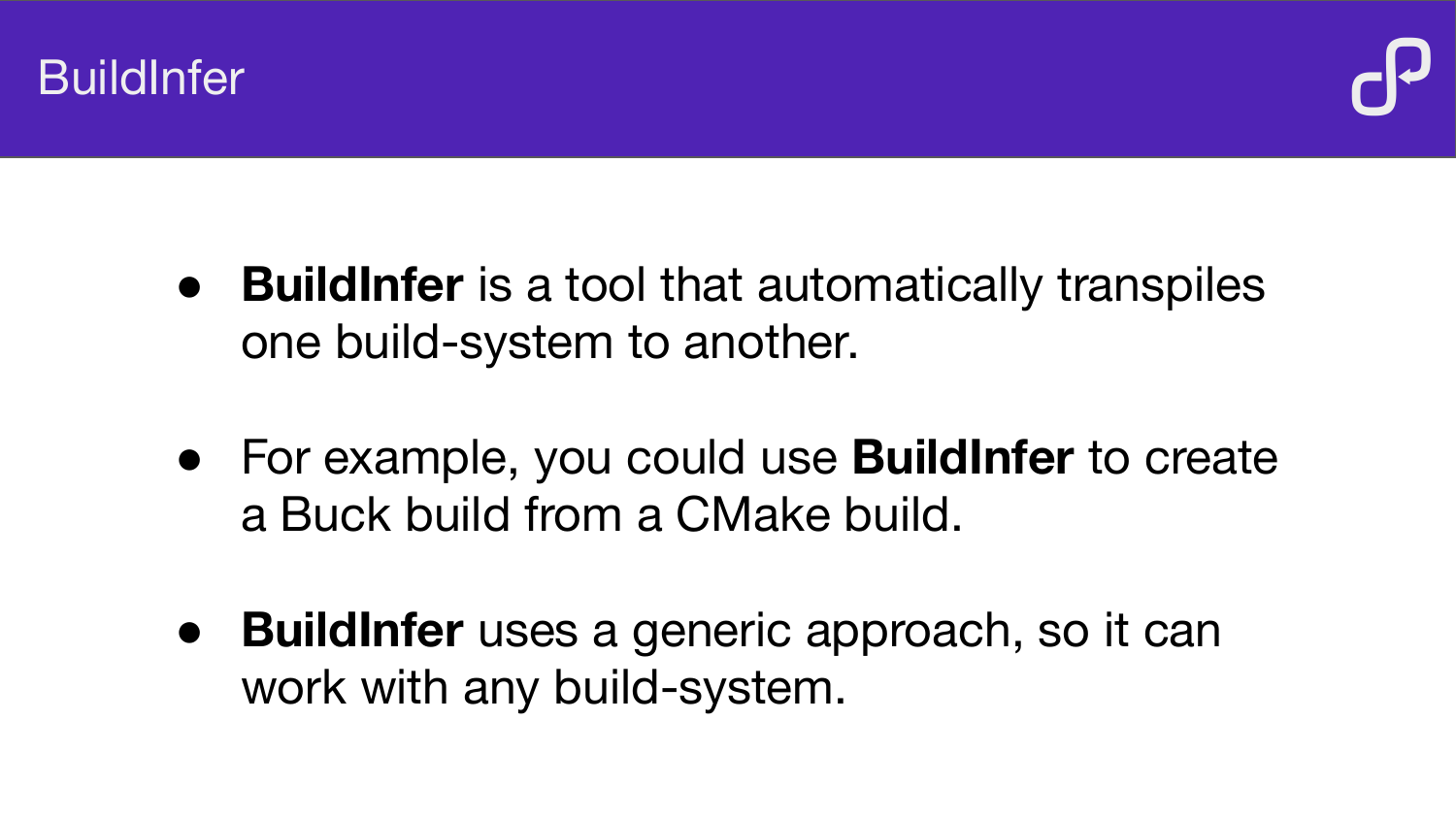 How BuildInfer uses ptrace to record system calls during a build, analyse the resulting event log, and automatically generate Buck or Bazel build files — demonstrated on LLVM, OpenCV, and Mapnik.